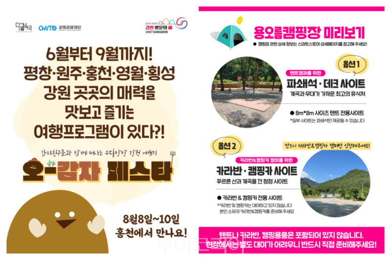 오늘(8일)부터 10일까지 2박 3일간 홍천 서석면 일대에서 열리는 ‘오감자 페스타 in 홍천’으로 여름캠핑 재미에 빠져보자. 이번 축제는강원관광재단과 홍천군 등 영서 내륙 5개 시군이 함께하는 ‘다섯발자국 관광마케팅협의회’ 사업의 일환이다.